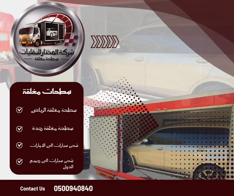 نقدم في شركة المختار للنقليات خدمات السطحة المغلقة لنقل وشحن السيارات داخل المملكة وخارجها، مع حماية كاملة للمركبات من العوامل الخارجية، والتزام دقيق بالمواعيد، وتجهيزات حديثة تناسب السيارات الفاخرة، الرياضية، والجديدة. خيارك الأمثل عندما تبحث عن نقل آمن، موثوق، وخالٍ من القلق.